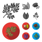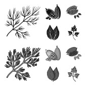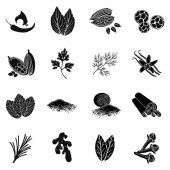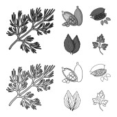 Koperek, ziarno kakaowe, bazylia. Zioła i przyprawy zestaw kolekcji ikon w kreskówce, czarny styl wektor symbol ilustracji w sieci web.