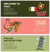 Witamy w Włochy nagłówki i tekst przykładowe szablony witryn sieci web. Włoski symbole architektura, oliwy z oliwek w butelce, wina i filiżanka kawy, monumentalna wieża, pizza kromka na białym tle ilustracja wektorowa