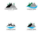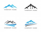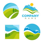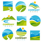 Natura Krajobraz szablony logo dla firmy lub agencji podróży i projektowanie identyfikacji wizualnej. Wektor krajobraz doliny rzecznej i słońce nad góry skały