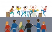 Zdjęcie "Kibice zespołu nożnej doping dla graczy. Fani piłki nożnej z krajowych atrybuty. Ilustracja kolorowy płaski wektor. Poziome na białym tle." może być wykorzystywane do celów osobistych i komercyjnych zgodnie z warunkami zakupionej licencji Royalty-free. Obraz jest dostępny do pobrania w jakości wysokiej rozdzielczości do 5760x3840.