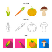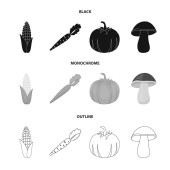 Kukurydza kukurydza, marchew witaminy z grzybami lasu blaty, dyni. Warzywa zestaw kolekcji ikon w czarne, płaskie, monochromatyczne styl wektor symbol ilustracji w sieci web.