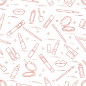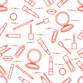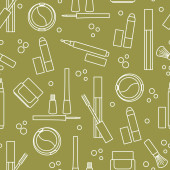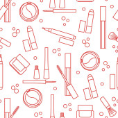 Jednolity wzór Kosmetyki dekoracyjne. Makijaż. Eyeliner, cienie do powiek, Pędzel, krem, tusz do rzęs. Styl glamour mody vogue.