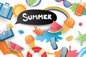 Witam lato z papieru wyciąć symbol ikonę tło plaża wakacje. Styl sztuki i rzemiosła. Wykorzystanie do banner, plakat, karty, cover, naklejki, odznaki, ilustracja projektu.