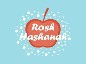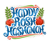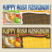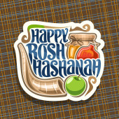 Wektor logo dla żydowskiego święta Rosz Haszana, brązowy znak z rytuału róg shofar, Koszerna, zdrowa żywność - jesień miód, żółte jabłko i słodki owoc granatu, oryginalny krój pędzla na słowo Rosz Haszana