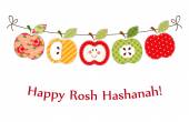 Wektor logo dla żydowskiego święta Rosz Haszana, cięcie papieru znak rytualnego róg, zdrowa żywność - jesień miód, zielone jabłuszko i słodki owoc granatu, oryginalny krój szczotka dla słowa szczęśliwy Rosz Haszana.