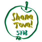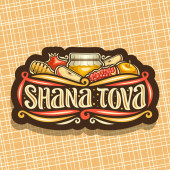 Wektor logo dla żydowskiego święta Rosz Haszana, cięcia papieru znak z miodem jesień w puli, drewniany kij, koszerne jedzenie - zielone jabłko i zdrowe granatu, oryginalny krój szczotka dla shana tova słowa.