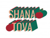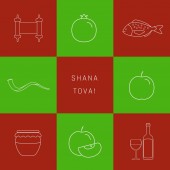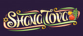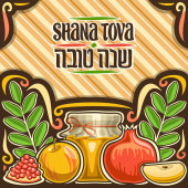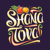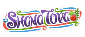 Wektor logo dla żydowskiego święta Rosz Haszana, niebieski znak z jesień miodem płynących z patykiem, zdrowa żywność - żółty apple i słodki owoc granatu, oryginalny krój szczotka dla słowa shana tova.
