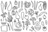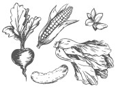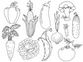Zestaw rysunek czarno-białe warzywa wektor ilustracja z kapusta grzyby marchew czosnek cebula ogórek na białym tle na jasnym tle