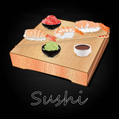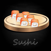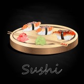 Różne rodzaje sushi serwowane na podłoże drewniane biurko czarne na białym tle.