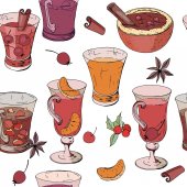 Różne rodzaje kawy i herbaty w pucharach. Tło wektor.
