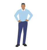 Człowiek sobie pół rękawy koszuli, obcisłe dżinsy i biegaczy, stojąc w pozie okrakiem