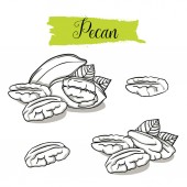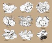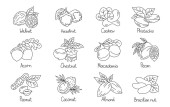 Ręcznie rysowane szkic stylu orzechy i nasiona z liści. Orzechy cedrowe nasiona. Pistacje, migdały, orzech, pecan, nerkowca, orzechów laskowych, macadamia i orzech brazylijski. Ekologiczne orzechy, wektor doodle ilustracje kolekcji na białym tle.