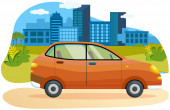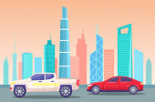 Fioletowy nowoczesny samochód jedzie na drodze w pobliżu drapacze chmur