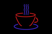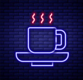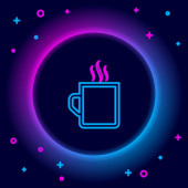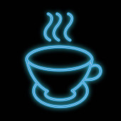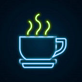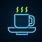 Neon znak pojedyncze sztuki linii ciągłej. Filiżanka kawy herbaty szklanki rano kawiarnia gorący napój sylwetka projekt jeden szkic zarys światło transparent wektor ilustracja koncepcja