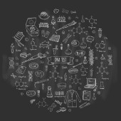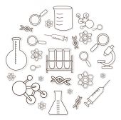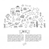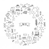 Zestaw ikon test Dna doodle wyciągnąć rękę. Ilustracja wektorowa. Laboratorium medyczne symbol kolekcji. Kreskówka nano technologii, medycyny, genomu elementów: badania substancji, cząsteczek, narzędzi, zasad azotowych