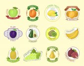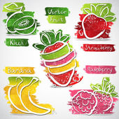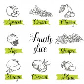 Ręcznie rysowane szkic stylu owoce i jagody. Mandarynka, pomarańczowy, kiwi, truskawek, bananów, jabłek, ananasów i gruszka. Organiczne owoce z liści, wektor doodle ilustracje kolekcji na białym tle.