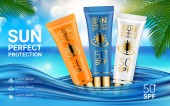 Ochrony przeciwsłonecznej spraye kremów z filtrami lato, szablon projektu kosmetycznych na plaży tle egzotycznych Palm liść. Koncepcja produktów reklamowych na oparzenia słoneczne. Realistyczne słońce ochrony produktu reklamy