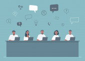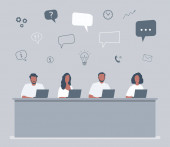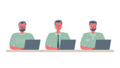 Bannery pracowników call center. Usługi pomocy technicznej. Młodych mężczyzn w słuchawkach siedział przy biurku. Ludzie ikony. Ilustracja wektorowa.