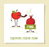 Rosz Haszana żydowskiego święta projekt z postaci z kreskówek śmieszne jabłka witting w karcie miód, reprezentujących symbole świąt. Ilustracja wektorowa