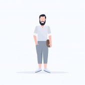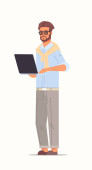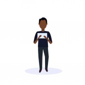brązowe włosy człowieka za pomocą tabletu stojący poza na białym tle sylwetka bezimiennych kreskówka mężczyzna znaków pełnej długości płaskie