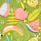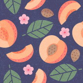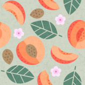 Zdjęcie "Brzoskwinie jednolity wzór. Całe i krojone brzoskwinie z liści i kwiatów na tle shabby. Oryginalna ilustracja płaskie proste. Stylu shabby." może być wykorzystywane do celów osobistych i komercyjnych zgodnie z warunkami zakupionej licencji Royalty-free. Obraz jest dostępny do pobrania w jakości wysokiej rozdzielczości do 5760x3840.