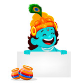 Szczęśliwy Krishna Janmashtami kartkę z życzeniami. Funny cartoon charakter Pan Kryszna indyjski Bóg, zestaw czterech pozach. Ilustracja wektorowa