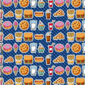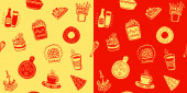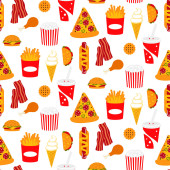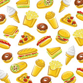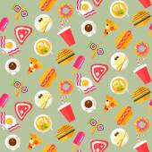 Zestaw fast food wzór tła. Restaurant menu ozdoba. Powtórz tło dla pokrywy, papier pakowy, tekstylny. Ilustracja wektorowa.