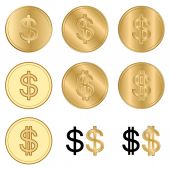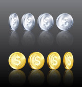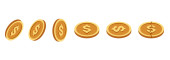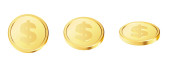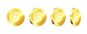 Zestaw złotych monet. Obrotowy 3d złote monety. Wektor ilustracja na białym tle