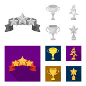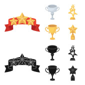 Srebrny Puchar za drugie miejsce, Złote gwiazdy na stoisku, kubek z gwiazdą, Złoty Puchar. Nagrody i trofea zestaw kolekcji ikon w kreskówce, www ilustracji symbol wektor styl monochromatyczny.