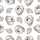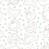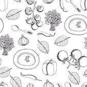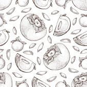 Zupa krem z dyni wektor wzór. Na białym tle ręcznie narysowane miskę zupy, łyżka, plastry kawałek dyni i nasiona. Warzywo ładny styl tła. Szczegółowe wegetariańskie jedzenie szkicu.