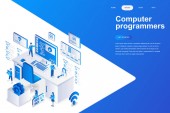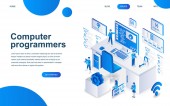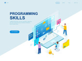 Nowoczesna, Płaska konstrukcja izometryczny koncepcja umiejętności programowania transparent i strony internetowej. Szablon strony docelowej. Twórca projektu zespołu inżynierów dla witryny kodowania. Ilustracja wektorowa.