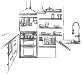 Zdjęcie "Kuchnia wnętrz rysunku, ilustracji wektorowych. Meble szkicu" może być wykorzystywane do celów osobistych i komercyjnych zgodnie z warunkami zakupionej licencji Royalty-free. Obraz jest dostępny do pobrania w jakości wysokiej rozdzielczości do 5760x3840.