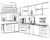 Kuchnia wnętrz rysunku, ilustracji wektorowych. Meble szkicu