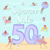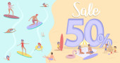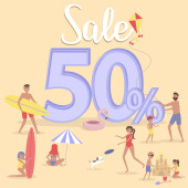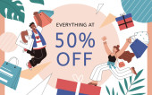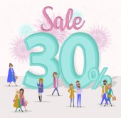 Sprzedaż plakat tło. Płaska konstrukcja grupy osób chodzenia w sklepie. Ilustracja wektorowa edycji.
