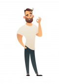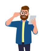Brodaty mężczyzna trzyma w ręku smartphone. Komunikacja w sieci, randek i sieci społecznych. Uzależnienia na gadżety. Ilustracja wektorowa w stylu cartoon