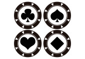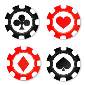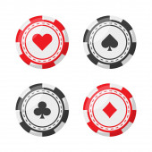 Czerwony i czarny poker żetony wektor gry zestaw. Kasyno żetony monety z symbolami kart do gry, serca, piki, kluby, diamenty.