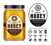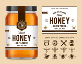 Wzór etykiet i opakowań miodu dla pasiek i produktów pszczelarskich, pasmanterii i tożsamości. Ilustracja miodu wektorowego.