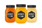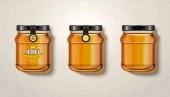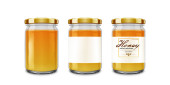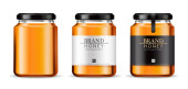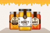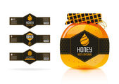 Miód szkło słój makiet z etykiety i pszczoły na białym tle. Miód koncepcji projektu opakowania. Projekt etykiety żywności.