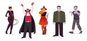 Minimalne scena na dzień halloween 31 października, z potworów, które obejmują szkło, dyni man, frankenstein, parasol, dracula, joker, czarownica kobieta. Wektor ilustracja na białym tle.