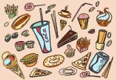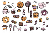 Kawy tła. Kolorowy styl kreskówka zestaw obiektów na temat kawy. Filiżanki do kawy i deserów na ciemnym tle. Exellent dla menu ozdoba projekt i kawiarnia. Ilustracja wektorowa.