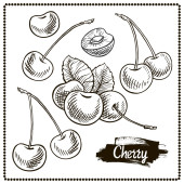 Styl szkic ręcznie rysowane Cherry zestaw. Pojedynczy, Grupa owoców, plastry, suszonych wiśni. Żywności ekologicznej, wektor doodle ilustracje kolekcji na białym tle.