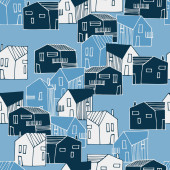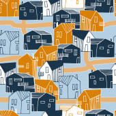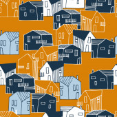 Wzór z domy i drzewa i dynie w czarnym i pomarańczowym, ręcznie rysowane tło halloween