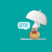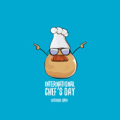 Z życzeniami dnia szef kuchni międzynarodowej. Wektor zabawny kreskówka kucharz Sowa kapelusz na niebieskim tle.