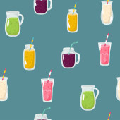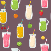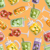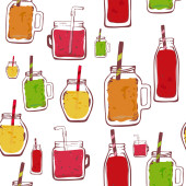 wektor organiczne owoce bez szwu wzór koktajl. butelka słoik, na białym tle. pyszne wegańskie napoje, pyszne soki, koktajle z jagody, owoce, warzywa. Zawijanie papieru, druku, tapeta