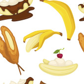 Rodzaje deserów, banana ze skórką i chleb piekarnia wektor wzór. Ciasta i polewy czekoladowe, naleśniki i miskę z zbóż. Knedle, pieczone żywności z cherry berry na białym tle posiłek