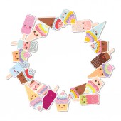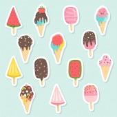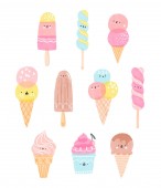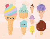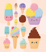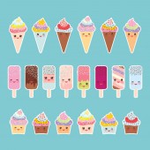 Kawaii pośród babeczki z kremem, lodów rożków, lody na patyku z różowymi policzkami i mrugając oczami, pastelowych kolorów na światło niebieskie tło. Ilustracja wektorowa