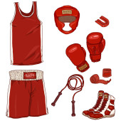 Wektor zestaw kreskówka Mma sprzęt treningowy. Czarny kolor Fightwear strój.