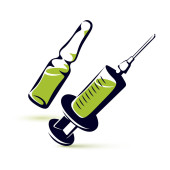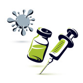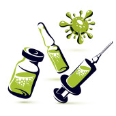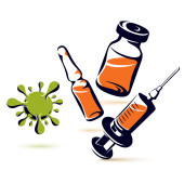Wektor graficzny ilustracja butelkę z lekiem i jednorazowe strzykawki do wstrzykiwań, aby zabić wirusa. Zaplanowane szczepienie tematu