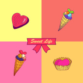 Kolorowe ikony słodyczy w formie serca. Smak tęczy. Wektor najprzyjemniejszy dzień w karty. Zawiera ikonę słodycze, słodkie różnych deserów na białym tle na różowym tle.