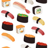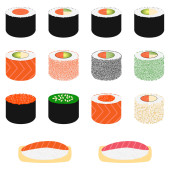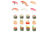 Zestaw 9 plasterków sushi rolls, tradycyjna Kuchnia Azjatycka. Klasyczny przepis na menu restauracji, dostawy witryn sieci Web, w widoku izometrycznym.